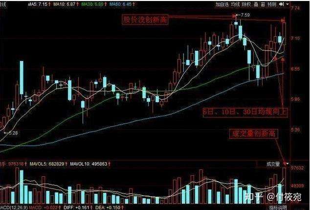 三、成交量立异高,但代价没立异高的股票,同时三根短时间均线(MA5,MA10,MA30)同时向上。
