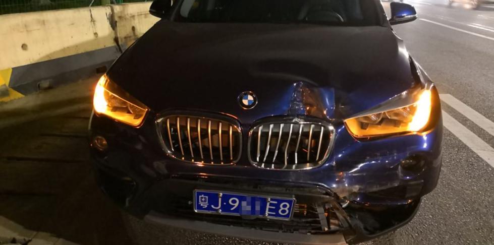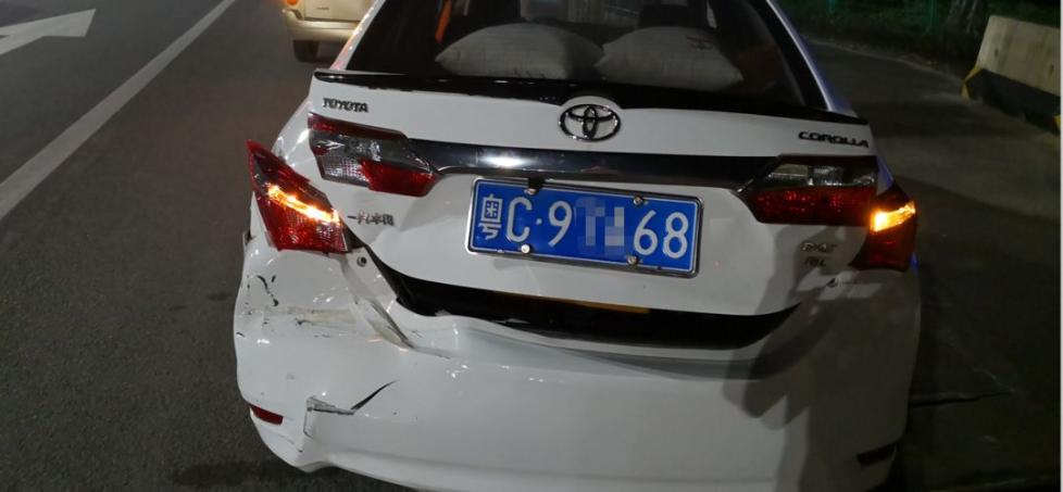 就在这时,最后面的一辆粤J9××E8号深蓝色宝马小车司机黄先生跟车过近,来不及反应,就这么撞了上去,导致三车撞在一起。▼