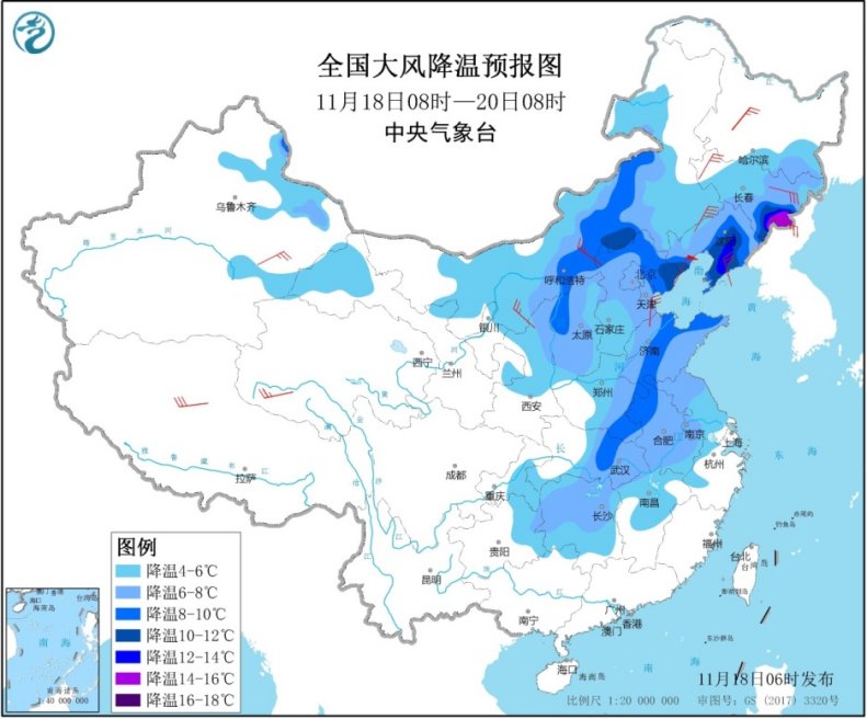 估计,11月18日08时至11月20日08时,受中等强度冷氛围影响,西南地域中南部、华北大部、黄淮、江汉、江淮、江南大部等地将呈现4~8℃降温,此中西南地域中南部局地可达12℃以上,并伴随5~7级偏冬风,阵风8~9级。受入海气旋与冷氛围的配合影响,18日白日至夜间,渤海、黄海北部和中东部海疆将有8~9级、阵风10~11级大风。中间景象台11月18日06时继承公布大风降温预告和海上大风黄色预警。