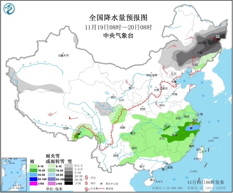 11月18日08时至19日08时,新疆北部、内蒙古中西部和东部偏南地域、西南地域中北部、东南地域西北部、西藏东部、青海南部、川西高原北部等地的部门地域有小到中雪或雨夹雪,此中,黑龙江西北部、吉林西部和北部、辽宁西部、内蒙古中部和东部偏南地域、河北北部等地有大到暴雪,部门地域大暴雪(20~29毫米)。西南地域南部、华北中部、黄淮东部、江汉东部、江淮北部和西部、江南西部等地的部门地域有中到大雨,此中,湖南西部、内蒙古西北部、辽宁大部、吉林中东部、黑龙江西北部等地有大到暴雨,辽宁西北部局地有大暴雨(100~120毫米)。东南地域东部、西南地域中南部、华北大部、黄淮大部、江汉东部、江南东部、西藏中西部等地的部门地域有5~7级风。