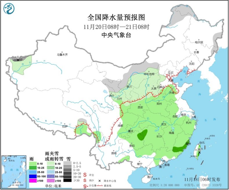 11月20日08时至21日08时,内蒙古西部和西南部、黑龙江东南部、新疆南疆盆地和南疆西部山区、东南地域西南部、华北西部等地部门地域有小雪或雨夹雪,此中,新疆南疆西部山区等地有中到大雪(5~8毫米)。东南地域西北部、黄淮大部、江汉、江淮西部、江南、东北地域东部、华南北部等地部门地域有小到中雨,此中,台湾岛东部局地有大雨(25~35毫米)。